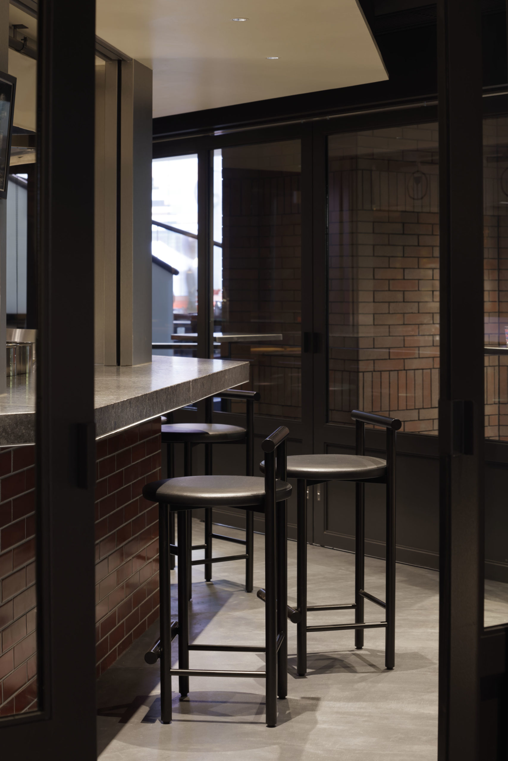 A wall-length installation by washi artist Wataru Hatano casts a layered texture, as if the umami of dashi were rising to the surface. Facing the installation, the tables run in alternation ― Hatano’s washi tops and laminated 60-millimetre timber tables in a pigmented finish ― a quiet cadence of fibre and grain. Overhead hang washi pendant lights in three scales ― large, medium, and small ― casting the gentle glow of paper lanterns throughout the room.